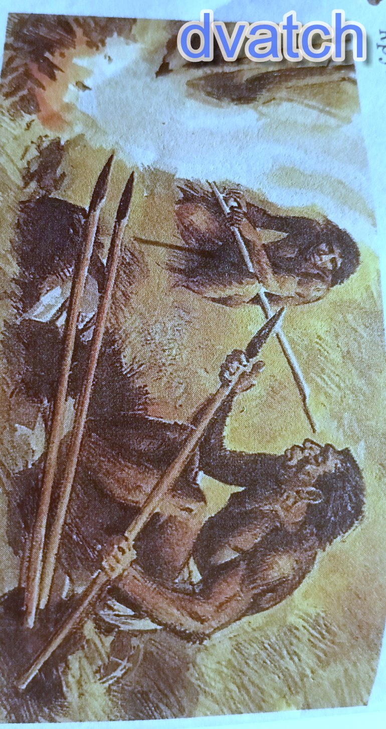 На данном рисунке древние люди изготавливают оружие-копья. Копья делались из деревянных палок, а наконечники из камня . Скорее всего изображено изготовление копья, момент скрепления палки и наконечника.