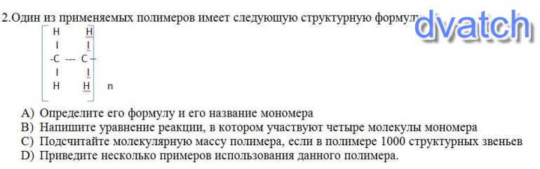 Один из применяемых полимеров имеет следующую структурную формулу:Н НI I-C --- C – I IH H nA) Определите его формулу и его название мономераB) Напишите уравнение реакции, в котором участвуют четыре молекулы мономераC) Подсчитайте молекулярную массу полимера, если в полимере 1000 структурных звеньев D) Приведите неКак узнать сколько примеров использования данного полимера.