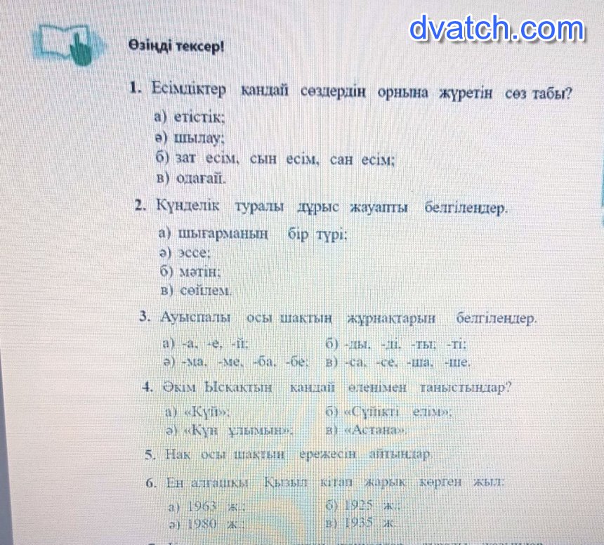 5) Нақ осы шақ қимылдың, іс-әрекеттің сөйлеп тұрған сәтте істеліп, болып жатқанын білдіреді. Нақ осы шақ етістіктің құрамына қарай жалаң және күрделі болып екіге бөлінеді.