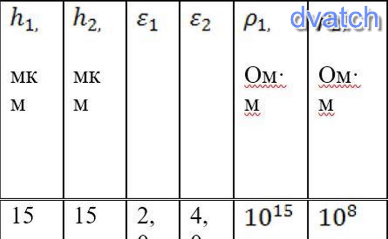 В конденсаторе использована 2-х слойная изоляция схема замещения которой представлена на рисунке. Определить напряженности электрического поля Е1 и Е2 в каждом слое конденсатора. В конденсаторе использованы пленочные материалы. Какая доля внешнего напряжения падает на каждом слое? Расчет провести для постоянного и переменного напряжения амплитудой 100 В.