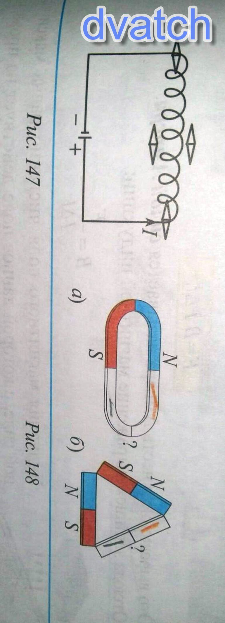 20 поинтов 1. На рис. 147 изображена катушка с током. вблизи катушки расположены четыре магнитные стрелки. перечертите рисунок своей тетради и покажите в нём плюса стрелок. 2. определите магнитные полюса в магнитной цепи, приведенной на рисунке 148 A,B