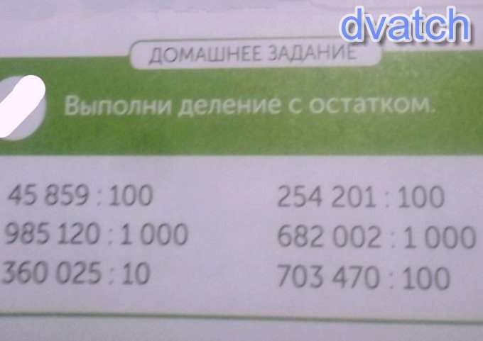 ДОМАШНЕЕ ЗАДАНИЕВыполни деление с остатком. 45 859:100985 120:1000360 025:10254 201:100682 002:1 000703 470:100