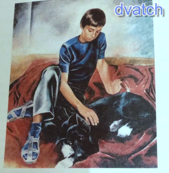 на на картине изображена тёплые дружественное чувства между Петей и Мухтаром. Друзья чувствуют себя расслабленно друг с другом. Картина выполнена так как-будто всё размыто водой. Это также способствует спокойствию персонажей.