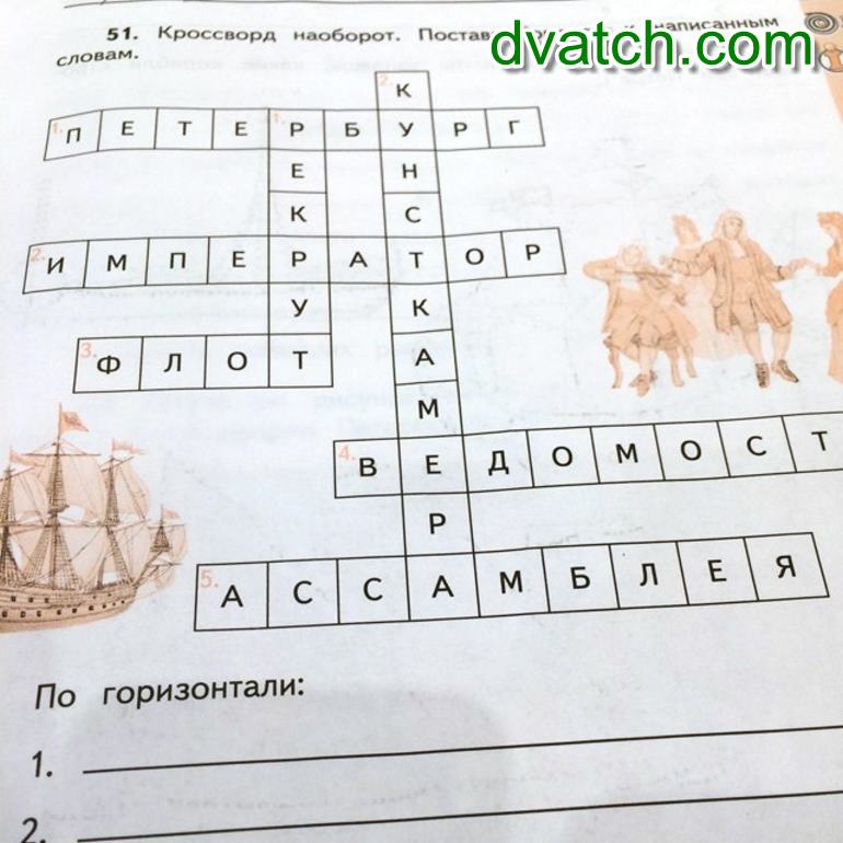 По горизонтали: 1) Второй самый крупный город в России. 2. ) Пётр 1 - . . . . . 3. )крупное объеденение объектов (кораблей, самолётов). 4. ) учетный документ, составленный в виде списка. 5. ) Название руководящей организации.