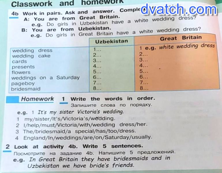 На первый уже существует . Второй: I must help Victoria with her wedding dress. Третий: The bridesmaid has a special dress, too. Пятый: In England, weddings are usually on Saturday.