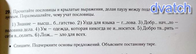 29. Прочитайте пословицы и крылатые выражения, делая паузу между подлежащим и ска- зуемым. Поразмышляйте, чему учат пословицы. 1) Знание - — высш. . . б. . . гатство. 2) Узда для языка — г. . . лова. 3) Добр. . . нач. ло — половина дела. 4) Ум — Одежда, которая никогда не и. . . носится. 5) Добро тв. . . рить — себя в. . . селить. 6) Лож. . . ЗЛО ДЛЯ всех. ей. KOM НИЯ. • Спишите. Подчеркните основы предложений. Объясните постановку тире.