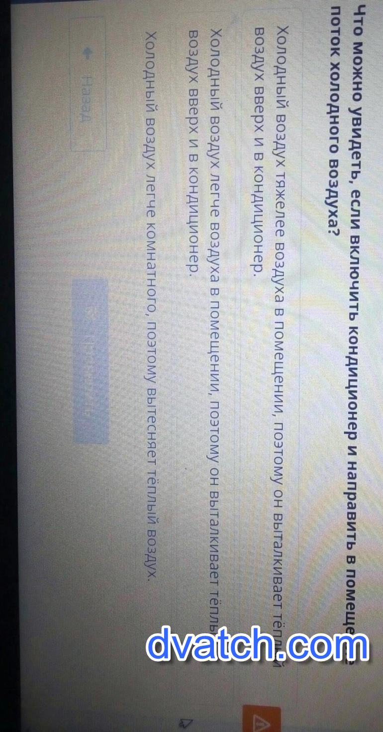 Что можно увидеть, если включить кондиционер и направить в помещениепоток холодного воздуха?Холодный воздух тяжелее воздуха в помещении, поэтому он выталкивает тёплыйвоздух вверх и в кондиционер. АХолодный воздух легче воздуха в помещении, поэтому он выталкивает тёплыйвоздух вверх и в кондиционер,Холодный воздух легче комнатного, поэтому вытесняет тёплый воздух. посчитайтее