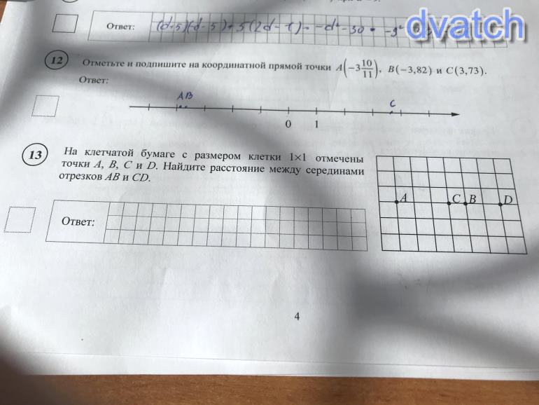 На клеточной бумаге с размером клетки 1*1 отмечены точки А,B,C и D. найдите расстояние между серединами отрезков AB и CD