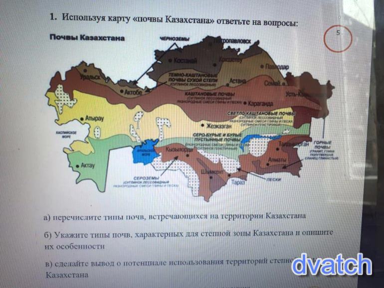 а) почвы сухой степи, каштановые почвы, пустынные почвы, светлокаштановые почвы, чернозёмы,горные почвы, серозёмы(на фото будут все виды почв в Казахстане,если надо)