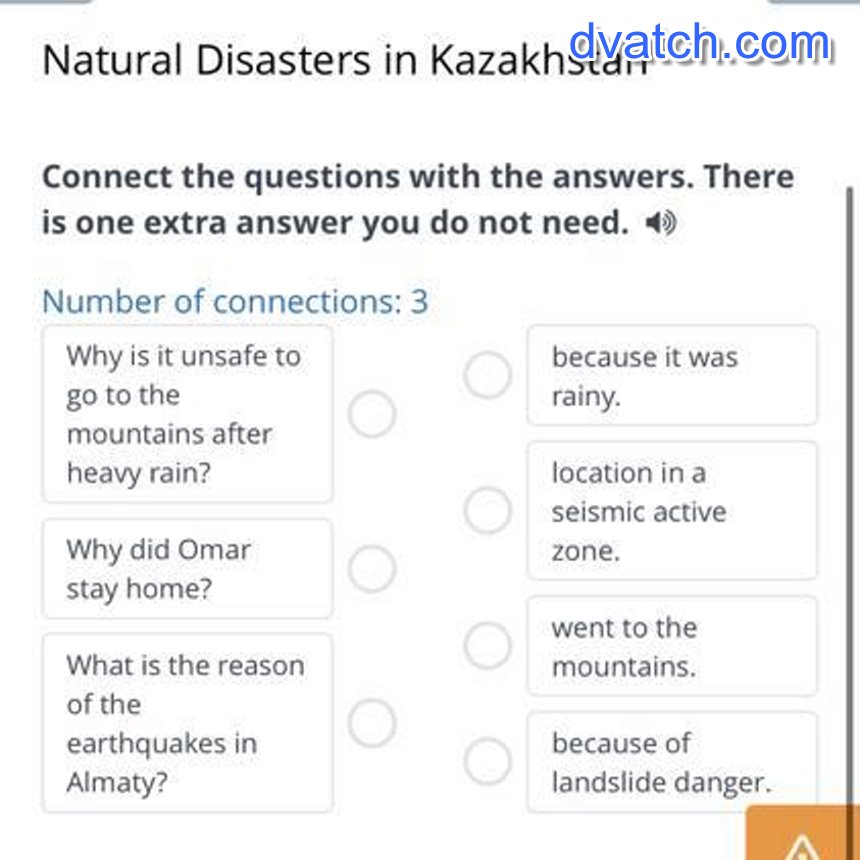 Natural Disasters in KazakhstanConnect the questions with the answers. There is one extra answer you do not need. Number of connections: 3Why is it unsafe to go to the mountains after heavy rain?Why did Omar stay home?What is the reason of the earthquakes in Almaty?because it was rainy. location in a seismic active zone. went to the mountains. because of landslide danger. посчитайте