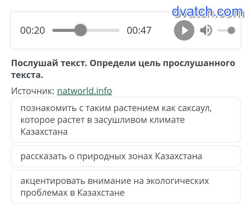 Растительный мир Казахстана 00:00 00:47 Послушай текст. Определи цель прослушанного текста. Источник:natworld. infoпознакомить с таким растением как саксаул, которое растет в засушливом климате Казахстана рассказать о природных зонах Казахстана акцентировать внимание на экологических проблемах в Казахстане