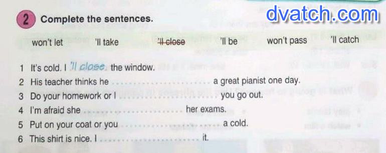 2 Complete the sentences. won't let 'll take close 'll be won't pass 'll catch 1 It's cold. I'll close the window. 2 His teacher thinks he a great pianist one day. 3 Do your homework or 1. you go out. 4 I'm afraid she 5 Put on your coat or you her exams. a cold. 6 This shirt is nice. I it.