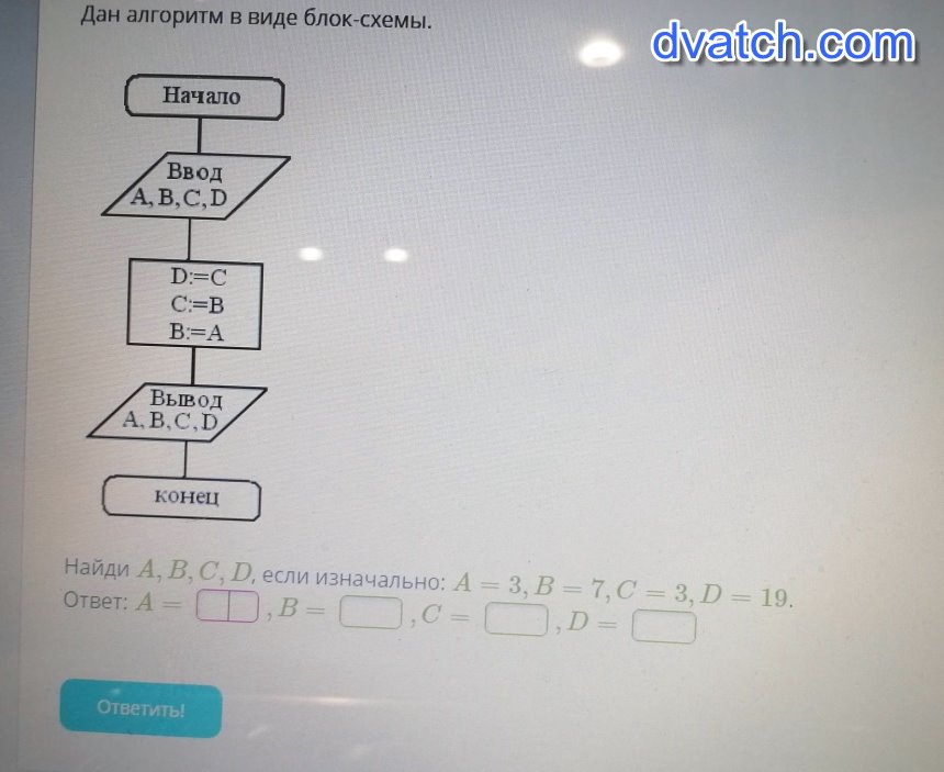 Изначально: A = 3, B = 7, C = 3, D = 19После D = C:
