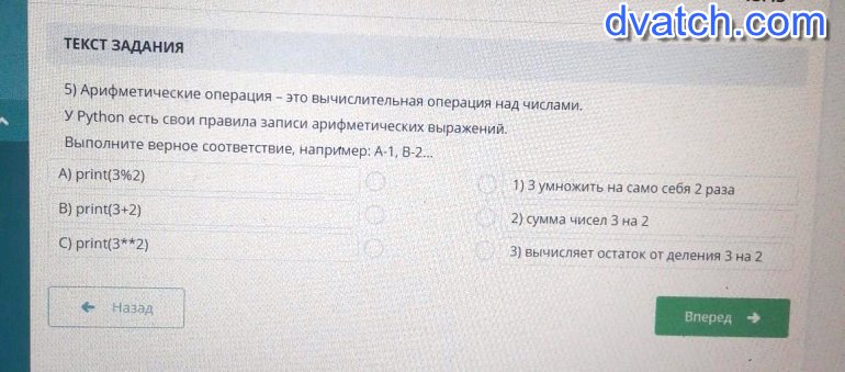 A) print(3%2) - 3 = вычисляет остаток от деления 3 на 2