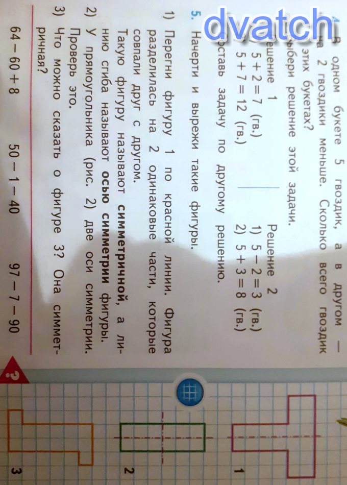 номер 5 посчитайте пжлначерти и вырежи 1 по красной линии. Фигура разделилась на одинаковые части, которые совпали друг с другом. Такую фигуру наз. симитричной, а линию сгиба наз. осью симметрии фигуры 2) У прямоугольника две оси симметрии проверь его 3)что можно сказать о фигуре 3? она симетричная?