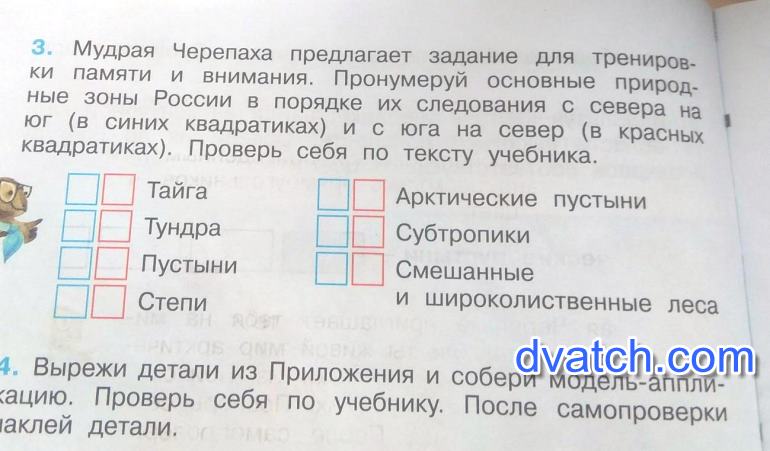 КИ памяти и 3. Мудрая Черепаха предлагает задание для трениров- внимания. Пронумеруй основные природ- ные зоны России в порядке их следования с севера на юг (в синих квадратиках) и с юга на север (в красных квадратиках). Проверь себя по тексту учебника. Тайга Арктические пустыни Тундра Субтропики Пустыни Смешанные Степи и широколиственные леса. ответьте Только пишите какое число и в каком квадрате ( красном или синим)