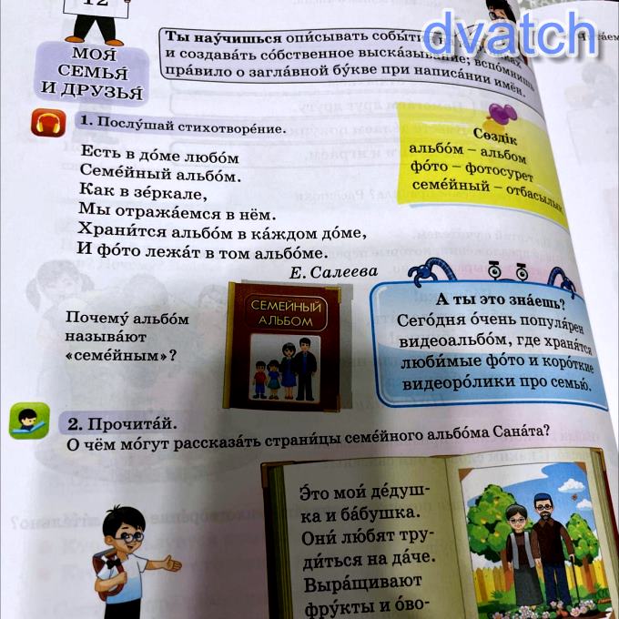 1Придумай название для моего аль-бома. Какие фотографии ещё есть втвоём семейном альбоме? Расскажи. Что бы ты посоветовал Санату ещё разместить в альбоме? Выпиши из альбо-ма предложения о занятиях членов твоей семьи. Подчеркнй слова-действия. На какой странице используются слова-действия единственного числа? Накакой - множественного числа?31