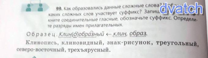 99. Как образовались данные сложные слова? В образовании каких сложных слов участвует суффикс? Запишите их, подчер- кните соединительные гласные, обозначьте суффикс. Определи- те разряды имен прилагательных. Образец. Клин(0)образный - Клин, образ. Клинопись, клиновидный, знак-рисунок, треугольный, северо-восточный, трехъярусный.