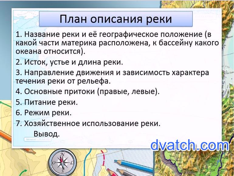 Наверно поможет 1. Название реки и её географическое положение в части материка расположена, к океану. 2. Исток, устье и длина составляет 5 гектаров.
