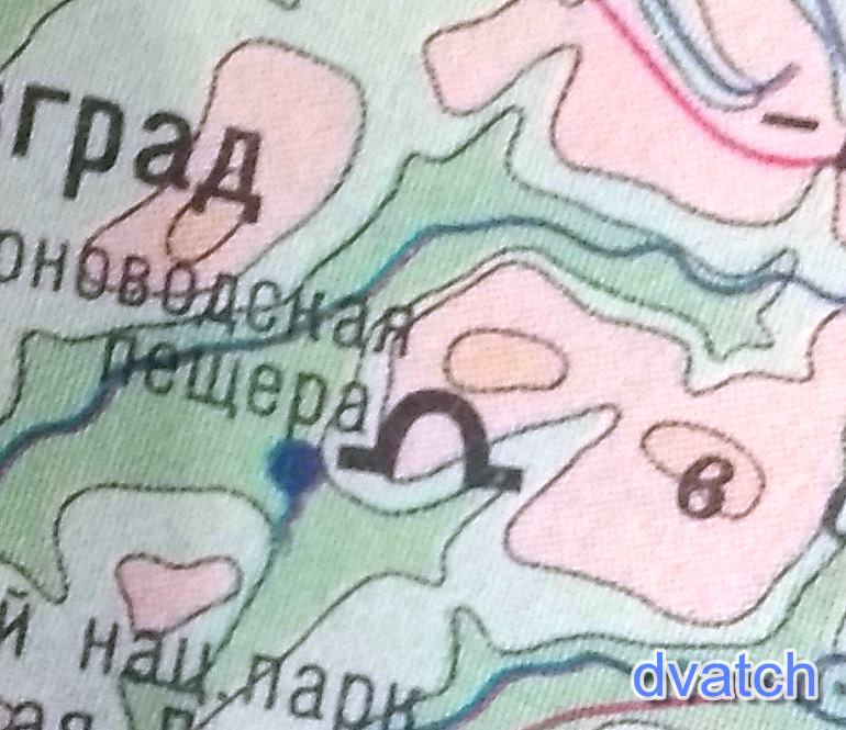 Если значек в виде арки, то это Пещеры. А если синий кружочек с хвостиком, то это Родник