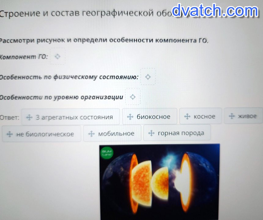 Строение и состав географической оболочки Рассмотри рисунок и определи особенности компонента ГО. Компонент Го: о Особенность по физическому состоянию: о Особенности по уровню организации Ответ: + 3 агрегатных состояния - биокосное КОсное - Живое не биологическое мобильное горная порода посчитайте