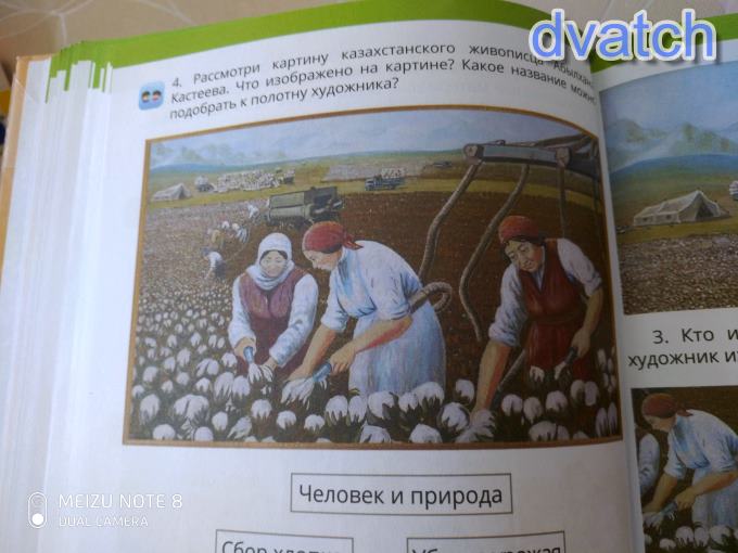 на первом плане мы можем увидеть женщин собирающих специальным "пылесосом" хлопок. на заднем плане мы видим машины которые увозят уже собранный хлопок. на поле работает множество людей. их труд не простой надо уважать таких людей. потому что благодаря им у нас есть хорошая одежда