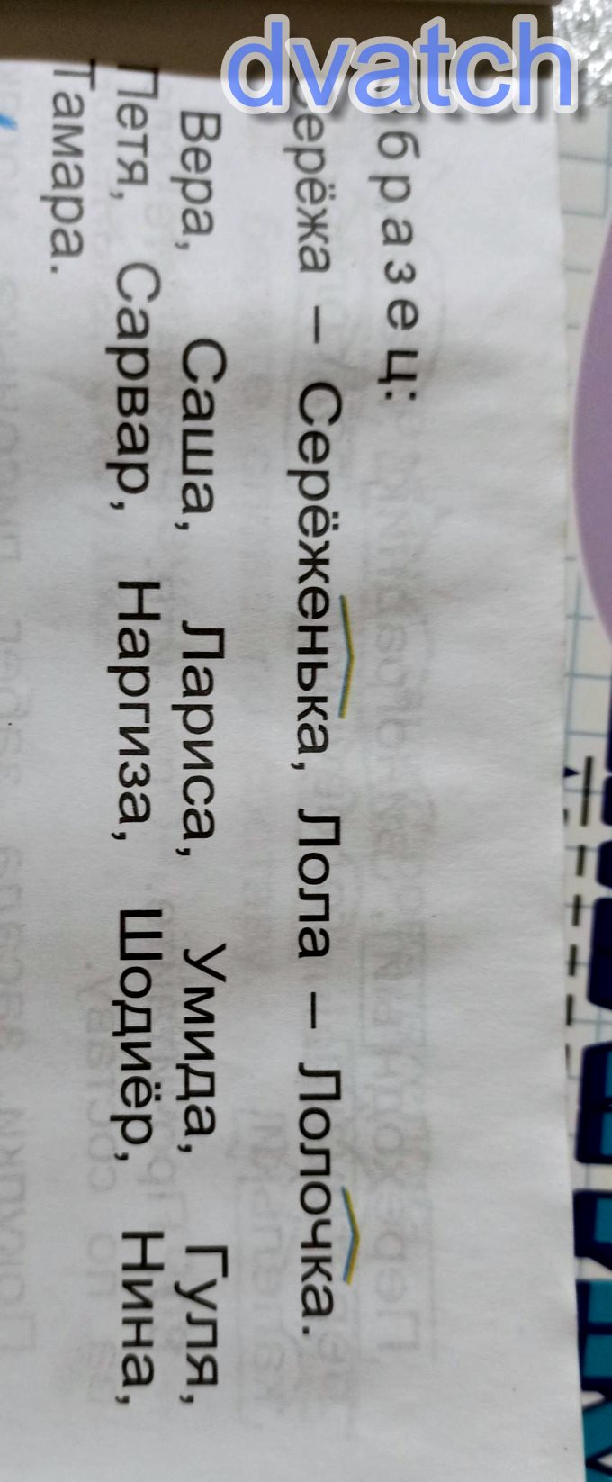 Вера-Верочка,Саша-Сашечка,Лариса-Ларисочка,Умида-Умидочка,Гуля-Гулечка,Петя-Петенька,Сарвар-Сарварушка,Наргиза-Наргизушка,Шодиёр-Шодиёрушка,Нина-Ниночка,Тамара-Тамарочка.