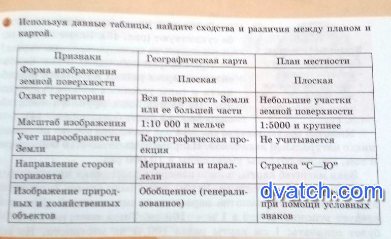 Используя данные таблицы, найдите сходства и различия между планом и картой. B Географическая карта План местности Признаки Форма изображения земной поверхности Охват территории Плоская Плоская Масштаб изображення Учет шарообразности Земли Направление сторон горизонта Изображение природ- ных и хозяйственных обьектов Вся поверхность Земли Небольшие участки или ее большей части земной поверхности 1:10 000 и мельче 1:5000 и крупнее Картографическая про- Не учитывается екция Меридианы и парал- Стрелка “С-ю" лели Обобщенное (генерали- Подробное описание, зованное) при помощи условных знаков