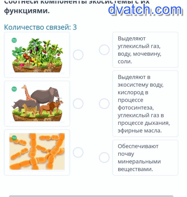 Соотнеси компоненты экосистемы с их функциями. Количество связей: 3Выделяютуглекислый газ, воду, мочевину, соли. Выделяют вэкосистему воду, кислород впроцессефотосинтеза,углекислый газ в процессе дыхания, эфирные масла. Обеспечивают почву минеральнымивеществами.