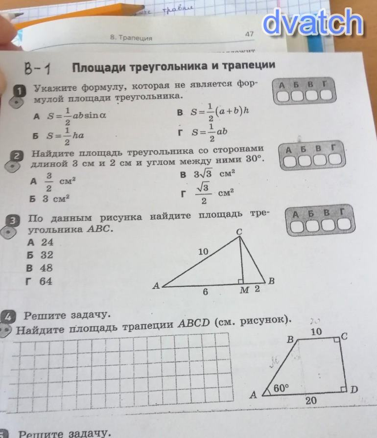 4- проводишь высоту из В там образуется угол в 30 градусов(180-60-90) сторона между А и высотой = 10 гипотенуза = 20 Пифагор(гип. *гип. =кат. *кат. +кат. *кат. ) находим высоту (400-100)=корень300 = 17корень 11 и потом 10+20/2*17корень11 итого 255кореней из 11 либо проверяющий офигеет от а либо ты в ее(его ) глазах станешь гением