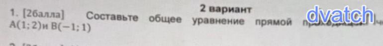 2 вариант1. (2балла) Составьте общее уравнение прямой проходящей через точкиА(1; 2) и B(-1: 1)