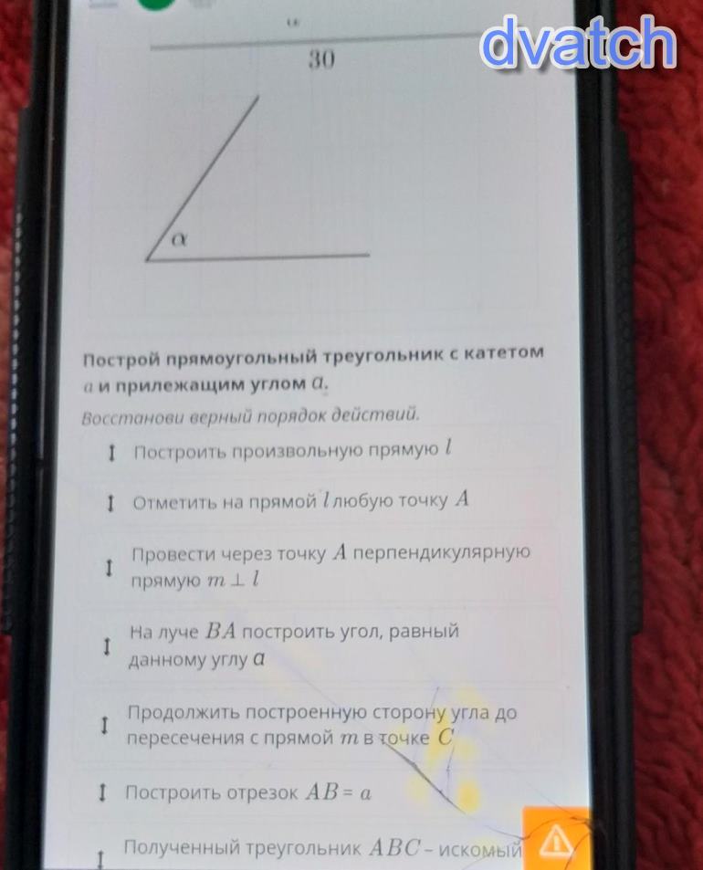 Продолжить построенную сторону угла до пересечения с прямой m в точке C