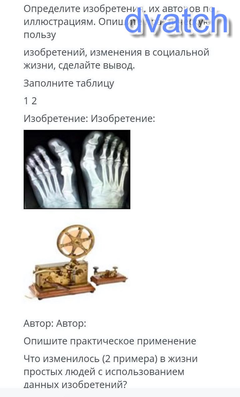 Определите изобретения, их авторов по иллюстрациям. Опишите практическую пользу изобретений, изменения в социальной жизни, сделайте вывод. Заполните таблицу 12 Изобретение: Изобретение: Автор: Автор: Опишите практическое применение Что изменилось (2 примера) в жизни простых людей с использованием данных изобретений? СРОООЧНО надо посчитайте