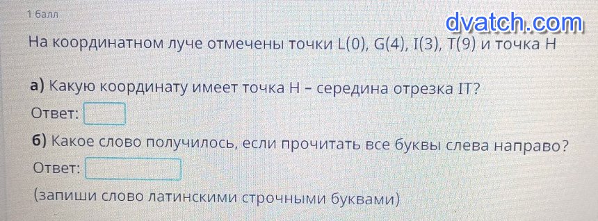 на координатном луче отмечены точки L(0), G(4), I(3), Т(9) и точка Ha) Какую координату имеет точка- середина отрезка IT?Ответ:б)Какое слово получилось, если прочитать все буквы слева направо?Оьвет(запишите слово латинскими строчными буквами)