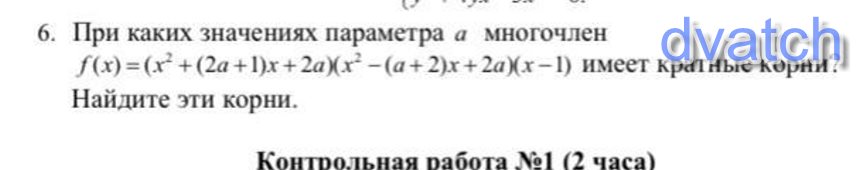 Многочлен имеет кратные корни, если они совпадают друг с другом, т. е. если `a=-2,5; a=1/3; ` `2a=-2,5; 2a=1/3; a=2a`. Отсюда, `a=-1,25; 1/6; 0`. : `0; 1/3; -1,25; -2,5; 1/6`.