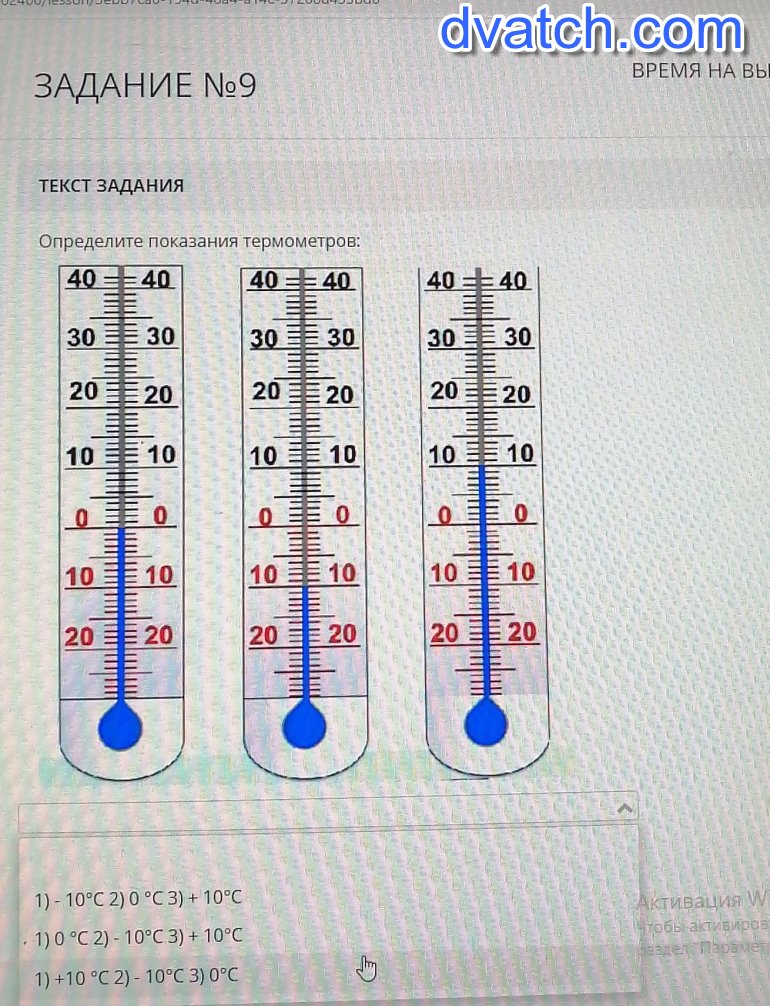 ЗАДАНИЕ No9ВРЕМЯ НА ВЫПОЛНЕН00ТЕКСТ ЗАДАНИЯОпределите показания термометров:40 ==4040 = 40403 403030303030 ЕЕ 30202020202020101010 SE 1010100000001010101010 1020 ЕЕ 2020 E№ 2020 E 2031) - 10°C 2) 0 °C 3) + 10°СВпеАктивация WinЧтобы активировать Windoраздел "Параметры1) 0 °C 2) - 10°C 3) + 10°С1) +10 °C 2) - 10°C 3) 0°C