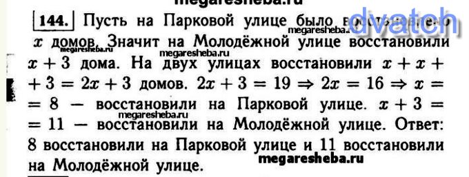 1) Пусть х домов восстановлено на Парковой улице, тогда (х+3) дома восстановили на Молодежной. Т. к. всего восстановили 19 домов, то составим( и решим (можно не записывать)) уравнение: