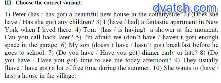 1 has 2 does she have 3 had 4 is having 5 havent got 6 doesnt have 7 have you got 8 do you have 9 have 10 have