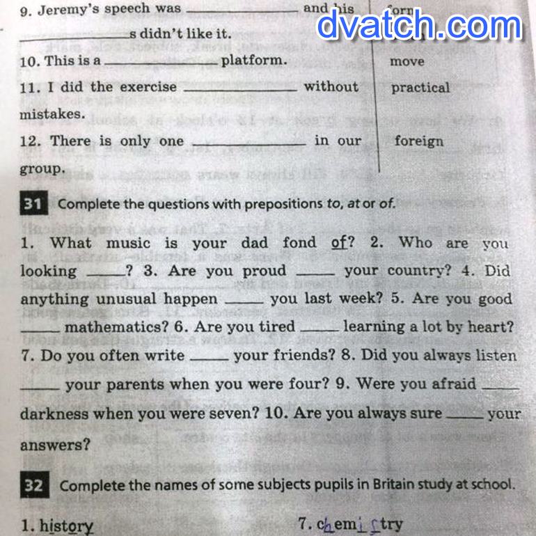 group. 31 Complete the questions with prepositions to, at or of1. What music is your dad fond of? 2. Who are youlooking ? 3. Are you proud your country? 4. Didanything unusual happen you last week? 5. Are you goodmathematics? 6. Are you tired learning a lot by heart?7. Do you often write your friends? 8. Did you always listenyour parents when you were four? 9. Were you afraiddarkness when you were seven? 10. Are you always sure youranswers? посчитайте