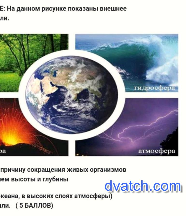 На данном рисунке показаны внешнее сферы Земли. Объясните причину сокращения живых организмов с изменением высоты и глубины (к глубине океана, в высоких слоях атмосферы) сферах Земли. [ ]
