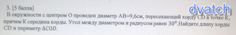 3. (5 балла)В окружности с центром О проведен диаметр AB=9,6см, пересекающий хорду CD в точке К,причем К середина хорды. Угол между диаметром и радиусом равен 30°. Найдите длину хордыCD и периметр COD посчитайте 100 поинтов