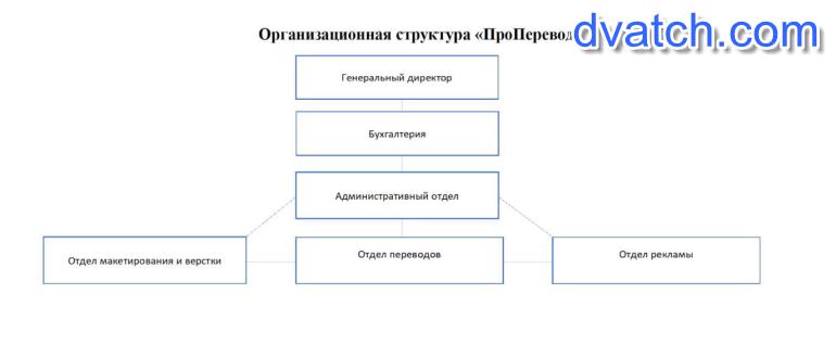 Если они подчинены Административному отделу, то тогда наклонные пунктирные линии необходимо заменить сплошными Г-образными, а на нижнем уровне управления горизонтальные сплошные линии либо совсем убрать (так как все 3 отдела подчинены одному начальнику), либо заменить их пунктирными, если в процессе работы 2 этих отдела обязаны согласовывать свои действия с Отделом переводов.