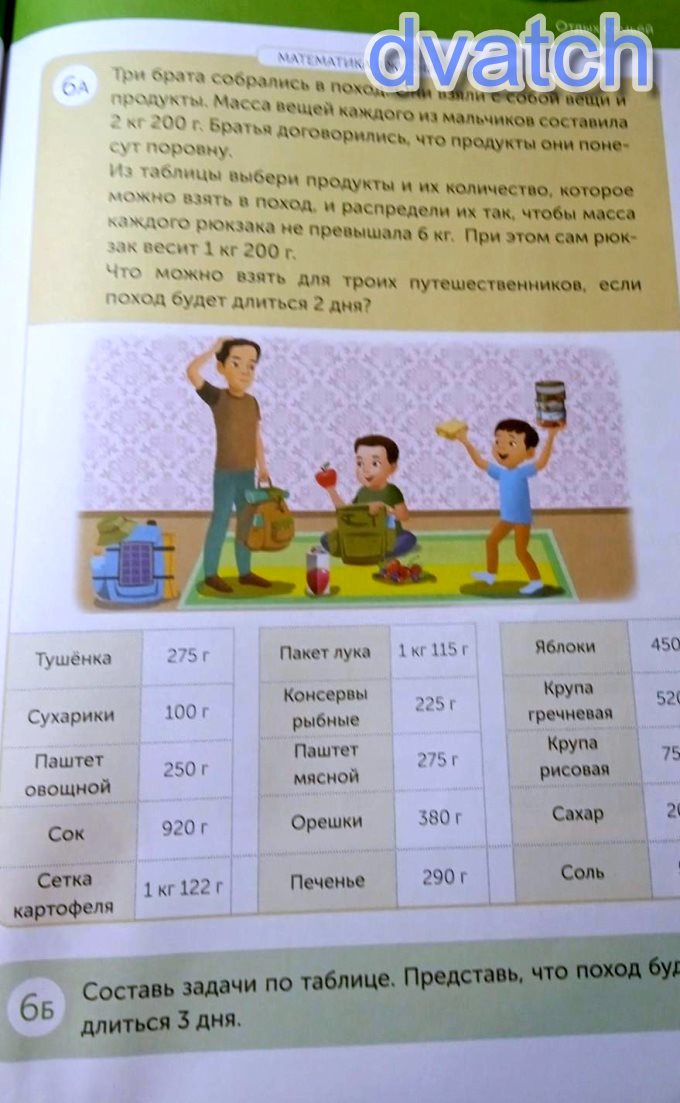 Тушенка 275 г Пакет лука 1 кг 115 г Яблоки 450 г Сухарики 100 г 225 г Консервы рыбные Паштет мясной 520 г Паштет овощной 250 г Крупа гречневая Крупа рисовая 275 г 750 г Сок 920 г Орешки 380 г Сахар 200 Сетка картофеля 1 кг 122 г Печенье 290 г Соль 50 г бы Составь задачи по таблице. Представь, что поход будет длиться 3 дня.