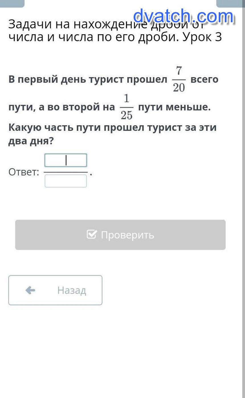 Задачи на нахождение дроби от числа и числа по его дроби. Урок 2 Турист прошел за три дня 32 км. В первый день он прошел пути,3/8 во второй день2/5 Как узнать сколько километров пути прошел турист в третий день? Ответ: КМ.