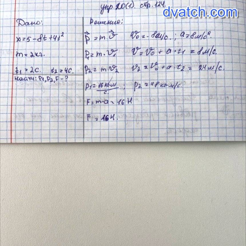 1. Движение материальной точки описывается уравнением х = 5 – 8t +4. Приняв массу равной 2 кг, найдите импульс тела через 2 си через4 с после начала движения, а также силу, вызвавшую изменение импульса.