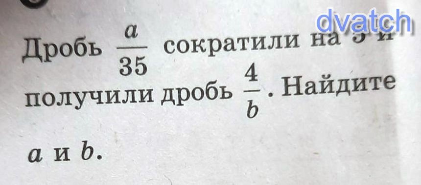 Если данную дробь разделили 5, то умножим вторую дробь на 5. В числителем получим 20, в знаменателе 5b. Эти дроби равны, значит равны числитель и знаменатель: а = 20 и 5b = 35, откуда b = 35:5 = 7