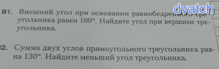 1. Внешний угол при основании равнобедренного треугольника равен 100 градусам. Значит смежный с ним угол основания равен 80 градусов. Углы при основании равны, следовательно угол при вершине равен