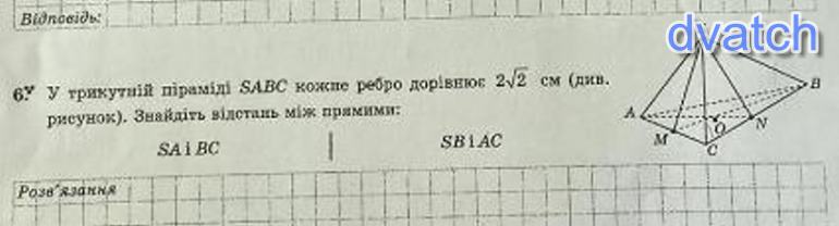 △АSN рівнобедренний, бічні сторони дорівнюють √6, а основа 2√2. За теоремою Піфагора, висота дорівнює √(6-2)=√4=2
