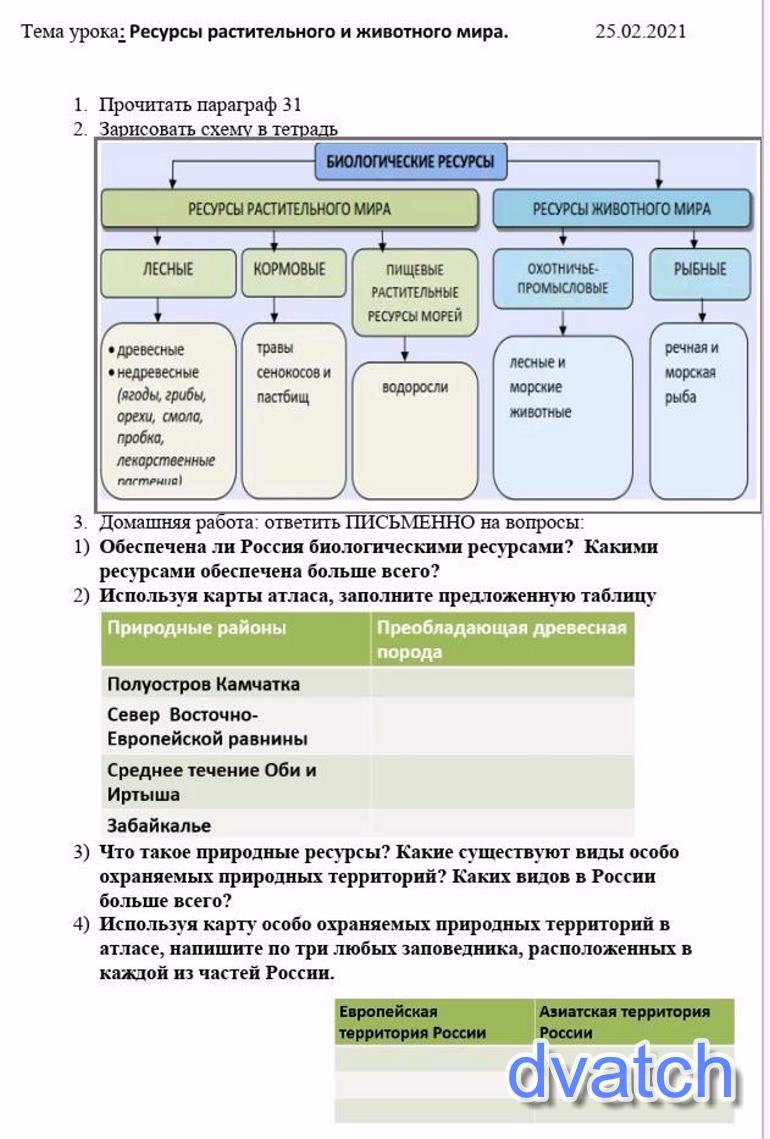 1) Россия в достаточной мере обеспечена биологическими ресурсами, в состав которых входят ресурсы животного и растительного мира. Больше всего Россия обеспечена лесными ресурсами.