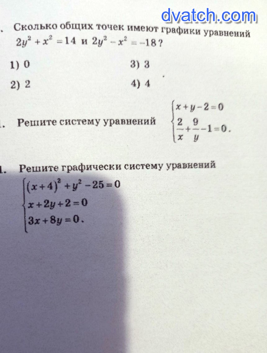 3. первое уравнение - уравнение окружности, радиуса 5, с центром в точке (-4;0), два другие уравнения - уравнения прямых. для построения которых находим две точки, Получили точку пересечения этих трех графиков. Это точка (-8;3), которая и является решением системы.